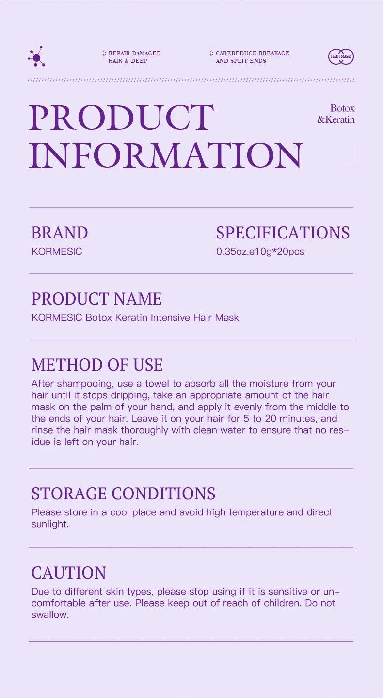 ●Improve hair quality, enrich and enhance plant extracts, deeply penetrate, repair damaged hair, enhance hair, lock in moisture and nutrients, and improve hair quality..
