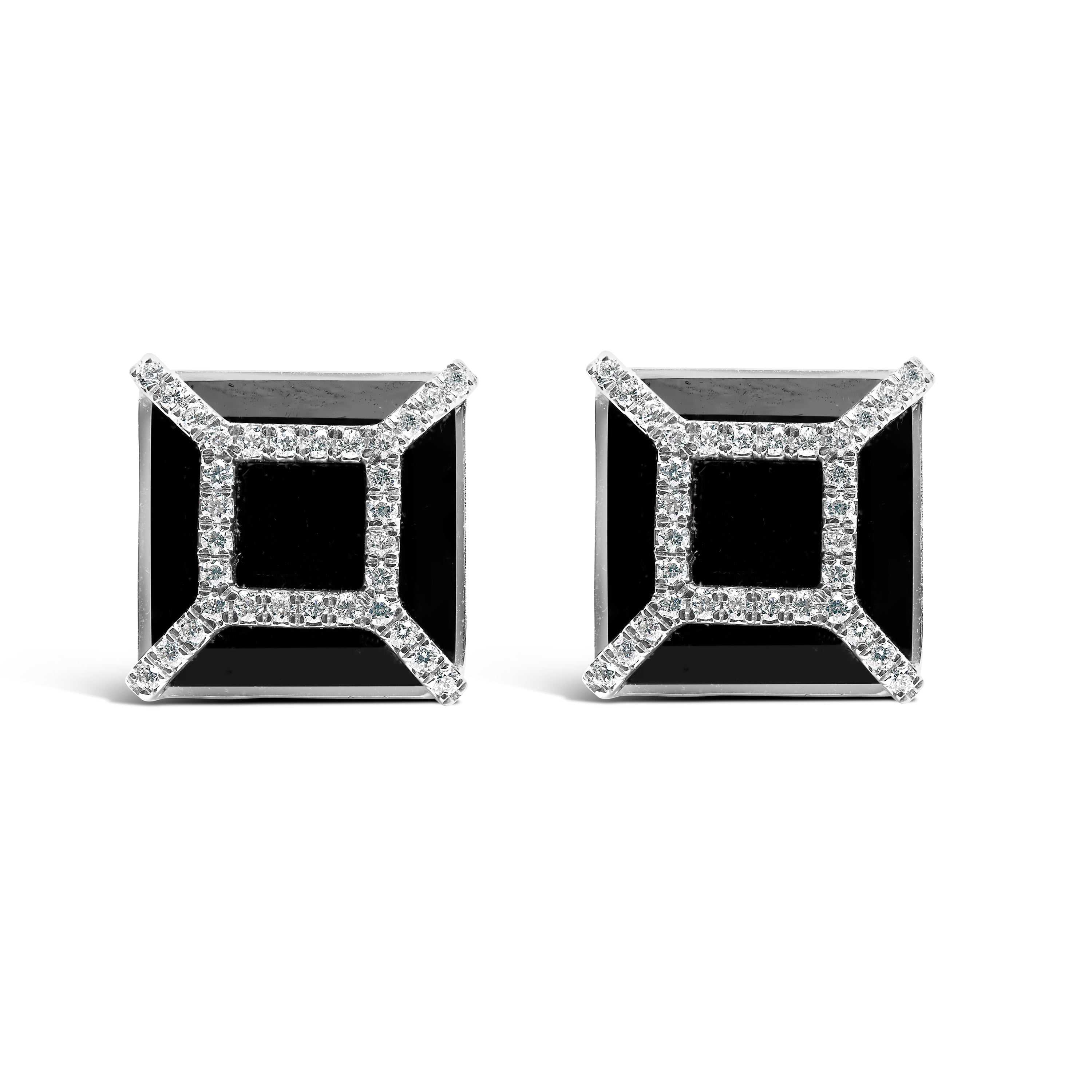 Immerse yourself in the timeless elegance of these stud earrings, where deep, color-enhanced black onyx meets the scintillating radiance of natural diamonds. Each stud cradles a cushion-cut 11x11mm black onyx, treated to underscore its profound allure, nestled within a halo of diamonds totaling 3/8 carats. These luminous gems boast a G-H color grade and SI1-SI2 clarity, expertly set in 14K white gold that has been rhodium-plated for an extravagant, enduring sheen. The geometric arrangement of the diamonds juxtaposes the onyx's velvety depth, crafting a stunning play of light and shadow. Designed for those who cherish sophistication intertwined with a hint of intrigue, these earrings promise to be a captivating addition to any ensemble, elevating moments from daily encounters to grand evenings. Earring secure with a push back.