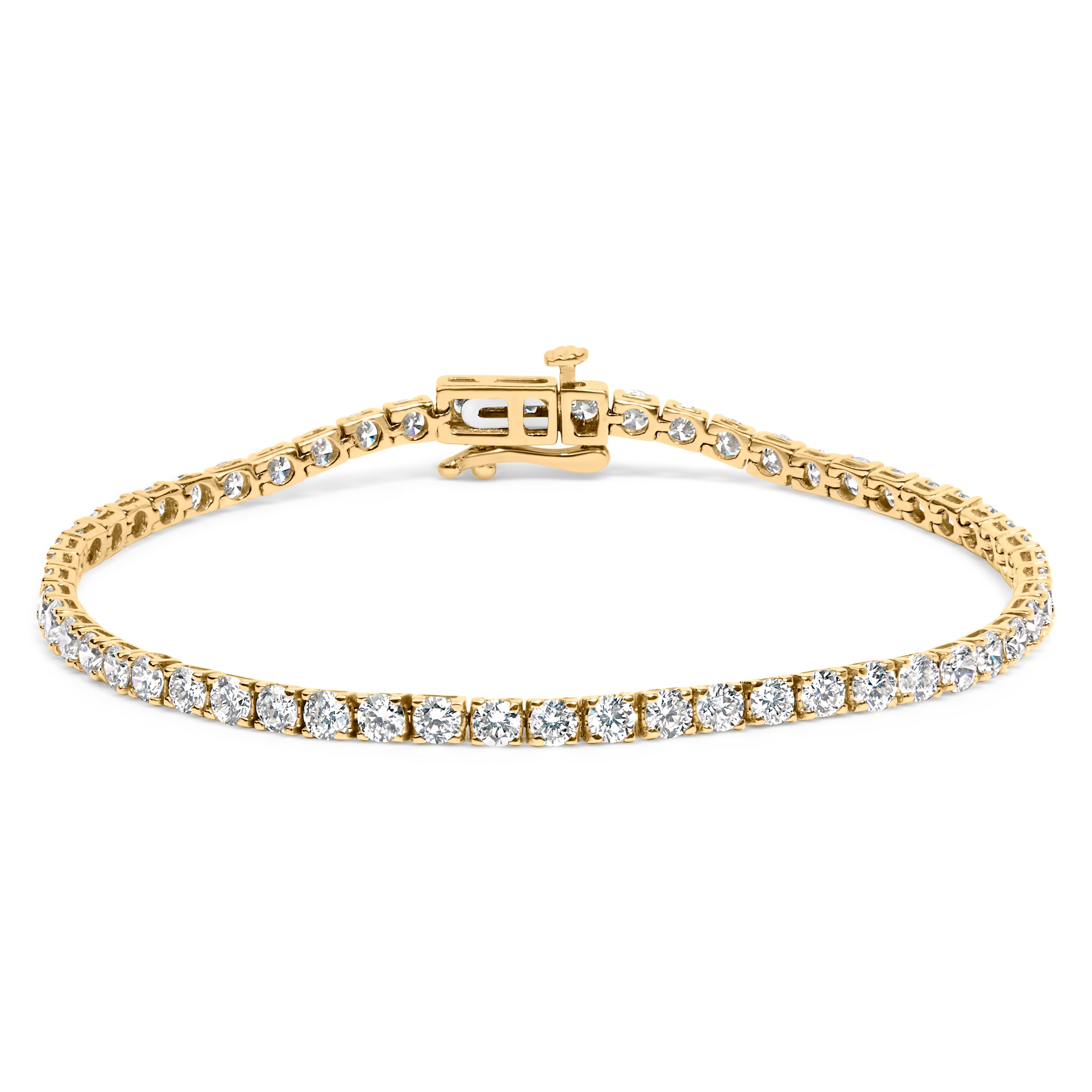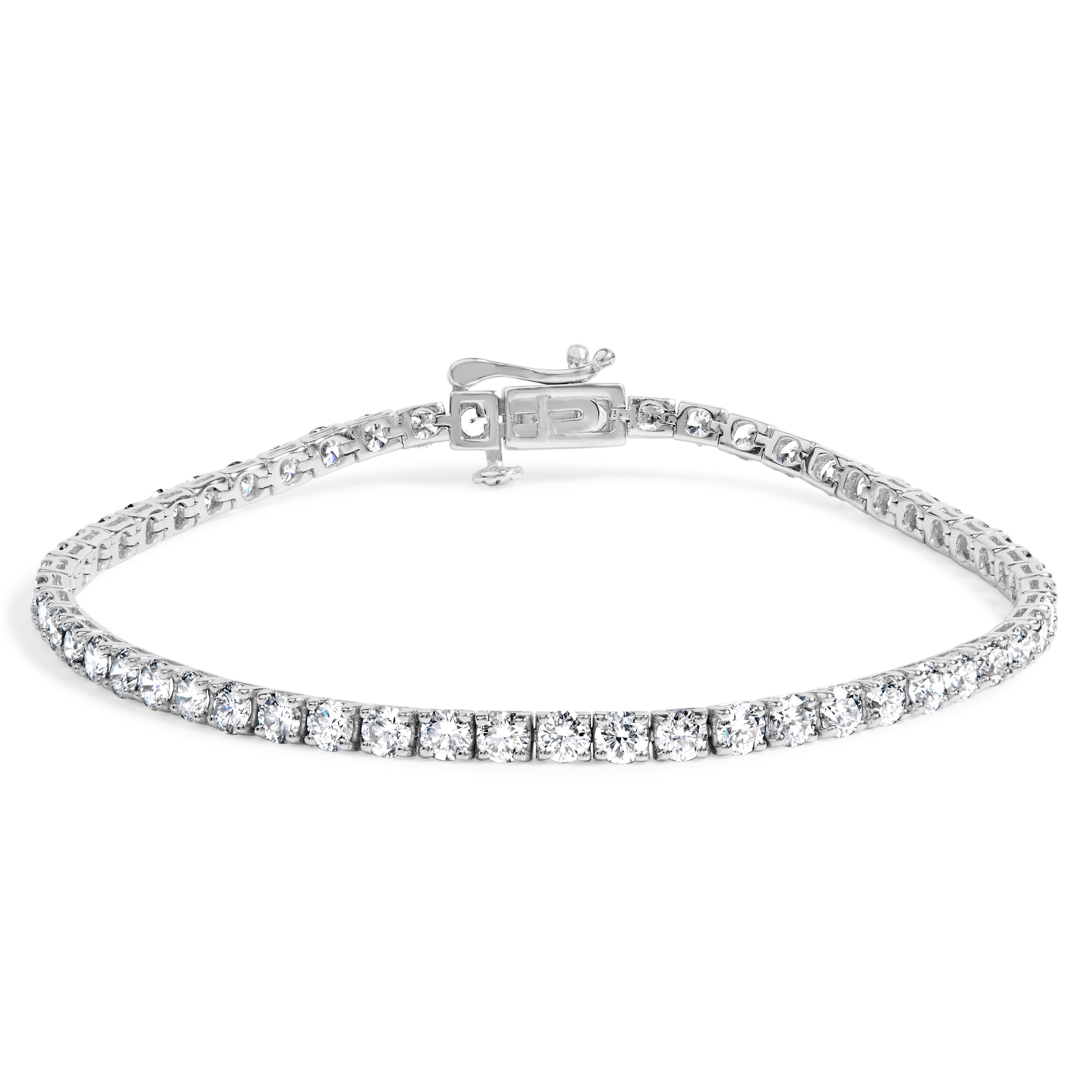 Crafted to captivate, this exquisite tennis bracelet, adorned with 5.0 carats of lab-grown diamonds, embodies luxury and elegance. Each round brilliant cut gem, resplendent in F-G color and VS1-VS2 clarity, is meticulously set in lustrous 14K white gold, capturing the light with every movement. Designed to embrace a 7.25-inch wrist, it secures with a robust box tongue clasp complemented by a safety latch, ensuring that its opulence is matched by its reliability. This piece not only represents the zenith of craftsmanship but also an ethical choice, highlighting the allure of diamonds cultivated with care and precision. Perfect for elevating everyday looks or accentuating the glamour of evening wear, it promises to be a timeless addition to any jewelry collection. 14K White gold is plated with rhodium.